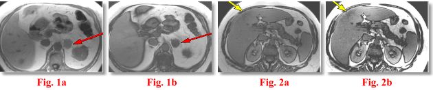DISCUSSION: Out-of-phase MR imaging relies on the fact that the protons in water and fat resonate at a slightly different frequency (220 Hz at 1.5 Tesla to be exact). This difference is exploited to cause the fat and water protons to be exactly “out-of-phase”, thus canceling each other out and causing a darker image. This is accomplished by varying the so-called echo-time (TE). At 1.5 Tesla, fat and water protons are “in-phase” at TE’s of about 0, 4.4, 8.8 msec, etc. and “out-of-phase” at TE’s of about 2.2, 6.6 msec, etc *. Out-of-phase MR images typically have a dark border around the organs (“boundary effect”) such as seen in Fig. 1b, 2b. Other fat-containing lesions can be diagnosed in the same manner. All the above MR images were obtained on AIC’s high-field Siemens Symphony utilizing ultrafast breath-hold scanning.