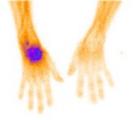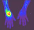 IMAGING FINDINGS: A triple-phase bone scan was obtained on AIC's dual-head nuclear camera. Fig. 1a-c show the angiographic (flow) images, blood pool images, and delayed (static) images of the wrists, respectively. They demonstrate marked increased uptake in the left wrist in all 3 phases of the study. Fig. 2a-b are selective pre and post-contrast MRI images of the left wrist showing precontrast T1-weighted (Fig. 1a) and postcontrast T1-weighted with Fat SAT (Fig. 1b). They demonstrate diffuse edema in the marrow of all the carpal bones and proximal metacarpal bones with diffuse enhancement of the marrow and surrounding synovium. X-rays (not shown) revealed diffuse osteopenia and erosions of the carpal bones.